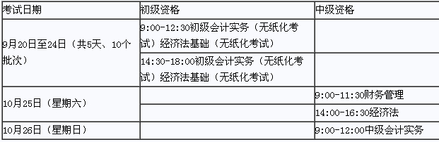 初級資格無紙化考試于9月20日至24日舉行(共5天,10個批次,具體考試批次和時間以準考證注明時間為準),中級資格考試于10月25日至26日舉行。